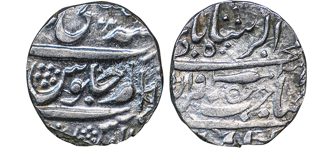 Gwalior State, Daulat Rao (AH 1209-1243 / 1794-1827 AD), Silver Rupee, 10.95g, Bhilsa Mint, in the name of Akbar II, trident symbol. (KM # 22). Fine+.
