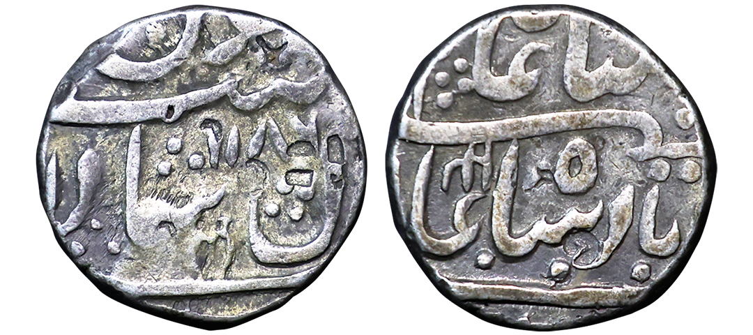 Gwalior State, Jayaji Rao (AH 1259-1304/1843-1886 AD), Silver Rupee, Gwalior Fort Mint, In the name of Muhammad Akbar II, Obv. Sikka Mubarak Saheb-e-qiran Sani Muhammad Akbar Badshah Ghazi, Rev. zarb Gwalior Fort off flan at the bottom, Nagari “Ji” for Jayaji, Bow & arrow pointed down, Graded by NGC as MS61, very tough series to get in MS quality, rare.