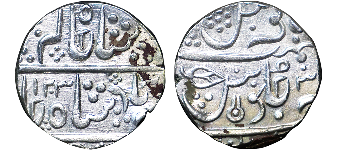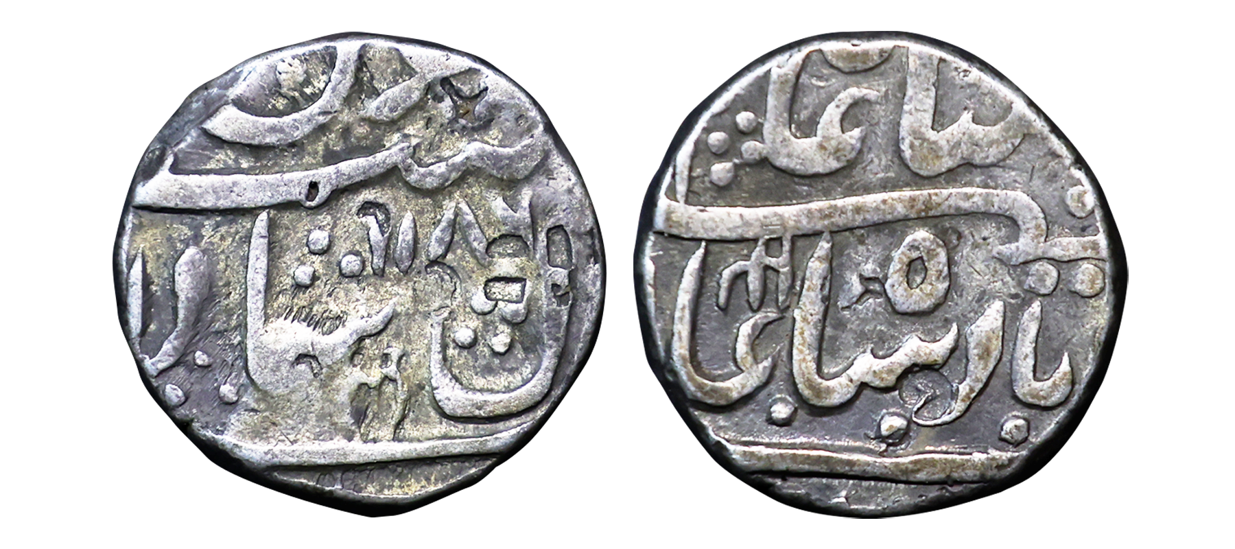 Hyderabad Feudatory, Narayanpett, Silver Rupee, 11.05g, Dilshadabad Mint, AH 1186, in the name of Shah Alam II, Nagari letter ‘Ti’ on obv and ‘La’ on rev for Latur. (KM # C40).