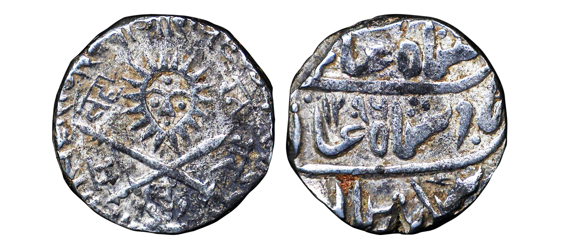 Indore State, Tukoji Rao III (VS 1960-1983 / 1903-1926 AD), Silver Rupee, 11.17g, Indore Mint, FE 1295, in the name of Shah Alam II, Obv: Crossed swords with sun face above. (KM # 39.2). Very Fine.