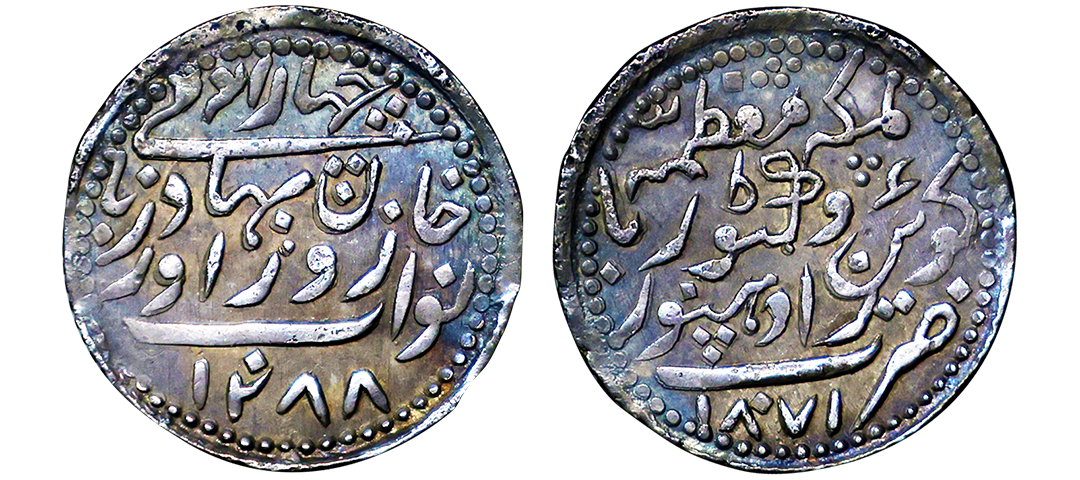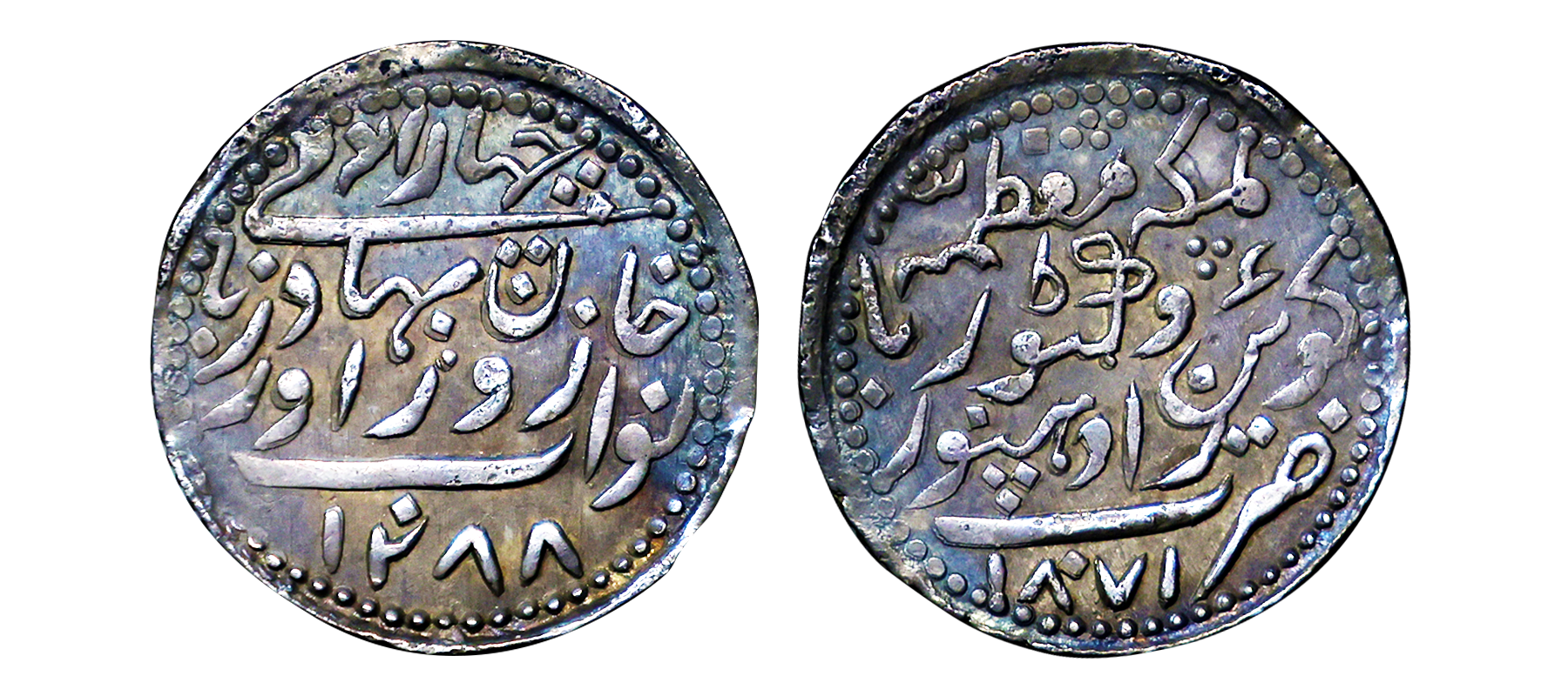 Patiala, Rajindar Singh (1876-1900 AD), Sahrind Mint, Silver Rupee, "Qadir-e-Bechun" Couplet, In the name of Ahmad Shah Durrani, Obv: Persian legend "hukm shud az qadir-e-bechun ba Ahmad Badshah, sikka-e-zan bar seem-o-zar az auj mahi ta bamah", Rev: a symbol of swad in seen of julus, with a complete figure of Katar(Dagger) mark and "zarb Sahrind" at the bottom, (KM#Y6), superb quality, graded by NGC as MS63, Very Rare in this grade. Note: NGC mentioned wrong ruler Mahindar Singh on the slab. Top-Pop, highest graded known coin for the type.