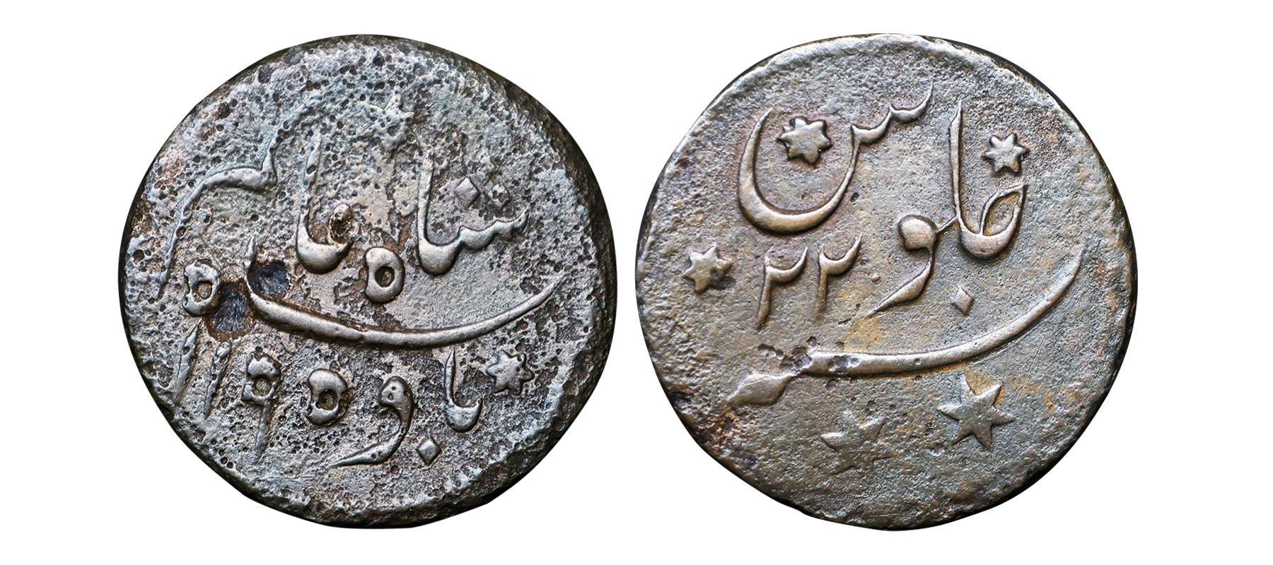 Bengal Presidency Princep’s Coinage, INO Shah Alam II (AH 1174-1221, 1759-1806 AD), Copper 1/2 Anna, 13.92 gms, Falta Mint, AH 1195, RY 22, KM # 127, fine, scarce.