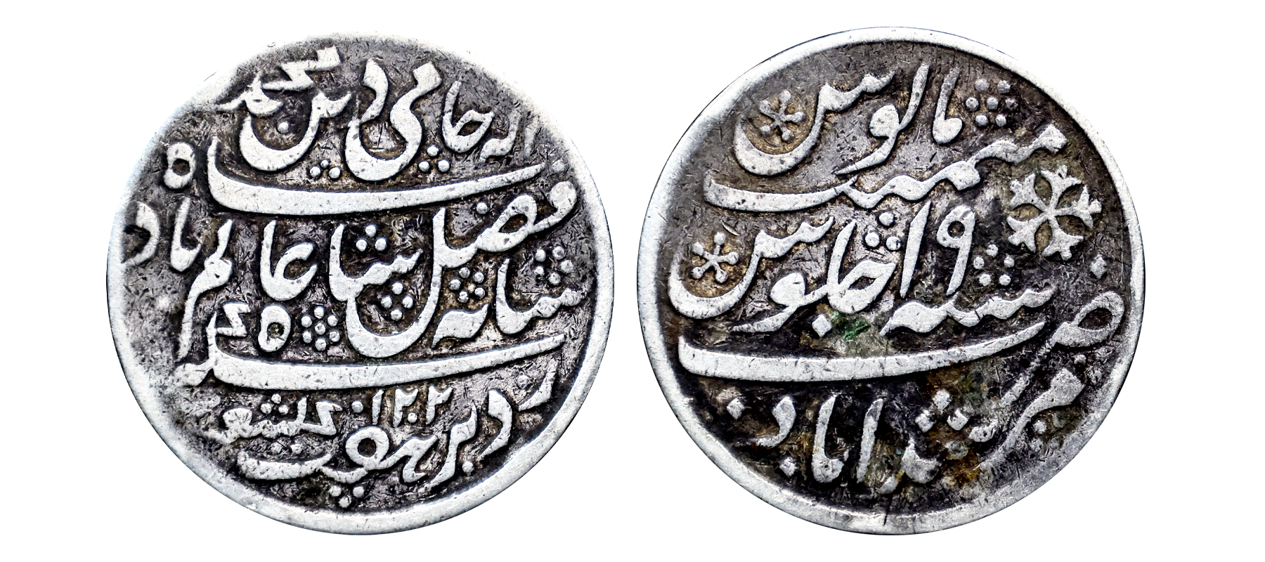 Bengal Presidency, Murshidabad Mint, Silver Rupee, in the name of Shah Alam II, AH 1202, frozen RY 19, 1792-1793 issue, oblique milling, semi-machine struck. 12.13g, Very Fine+, Very Rare.
