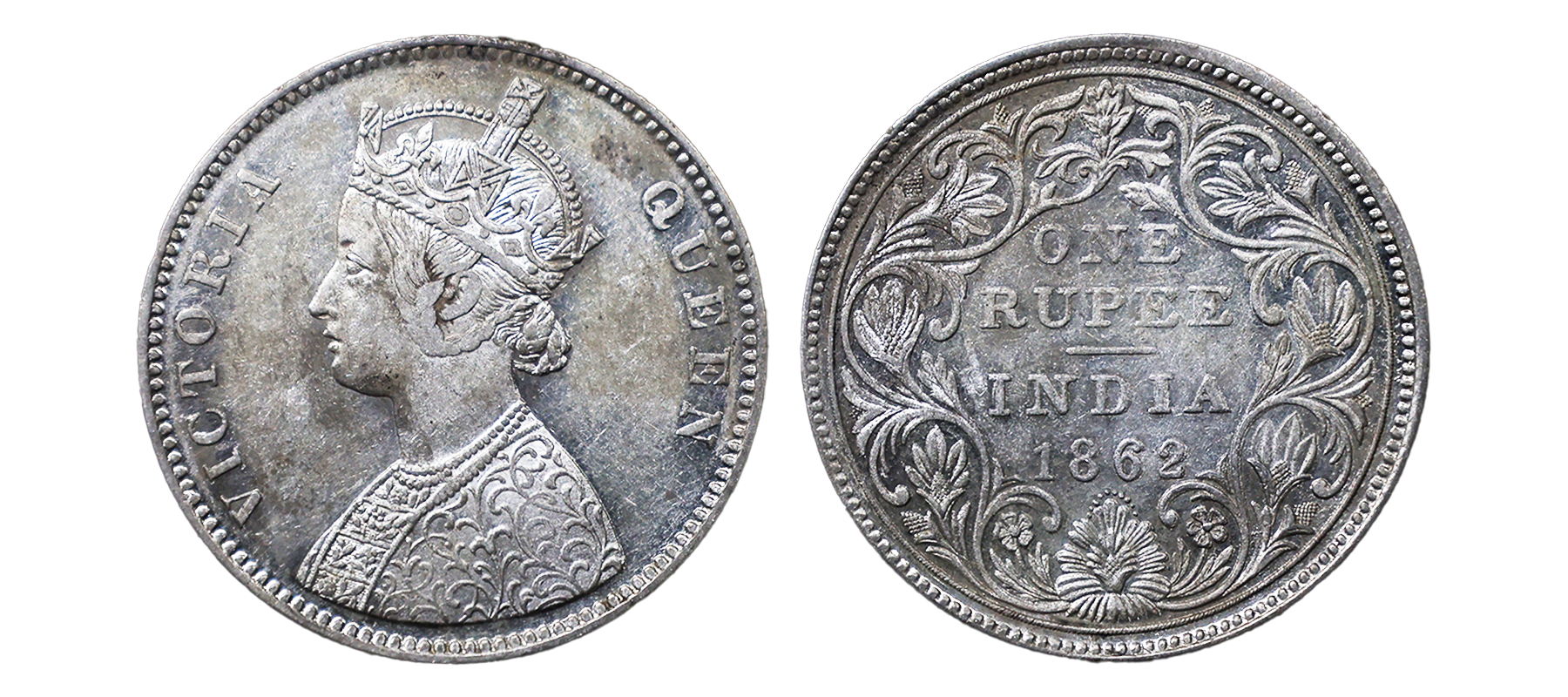 Victoria Queen, Silver Rupee, 1862, A/I, 1/1 dots, struck on earlier used dies of 0/4 dots, very rare variety.