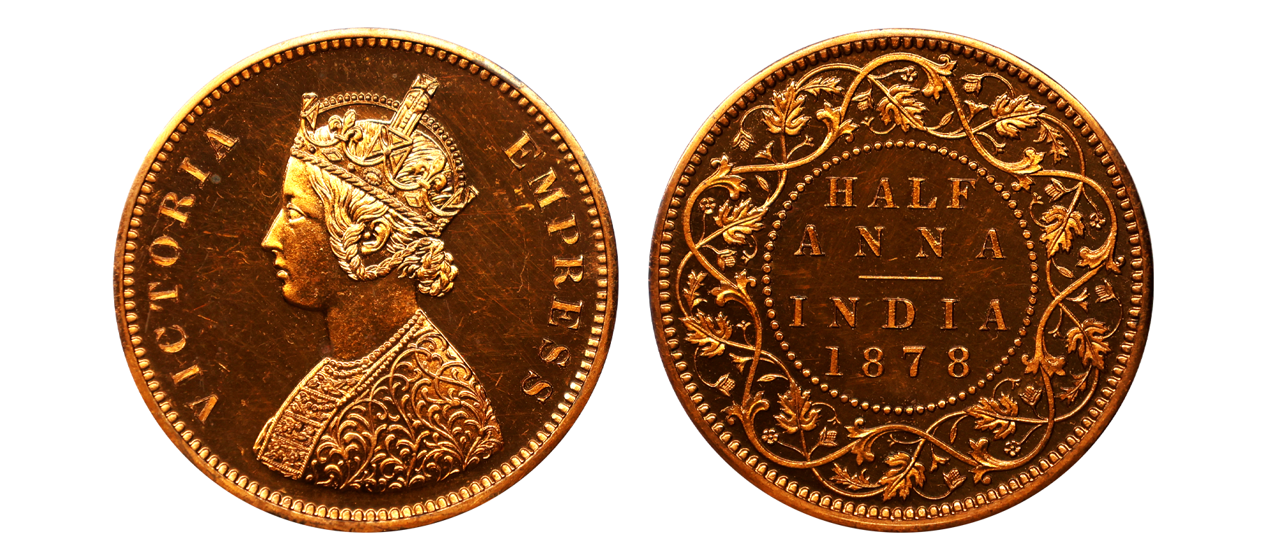 Victoria Empress, gold mohur, 1882, Calcutta mint, two flowers in bottom panel and 'V' in jabot on obverse and 'C' privy mark below beaded circle under the date on reverse, S&W 6.11; PR 19, 11.64g. Very fine, Very rare.