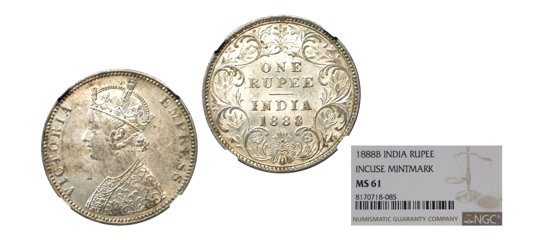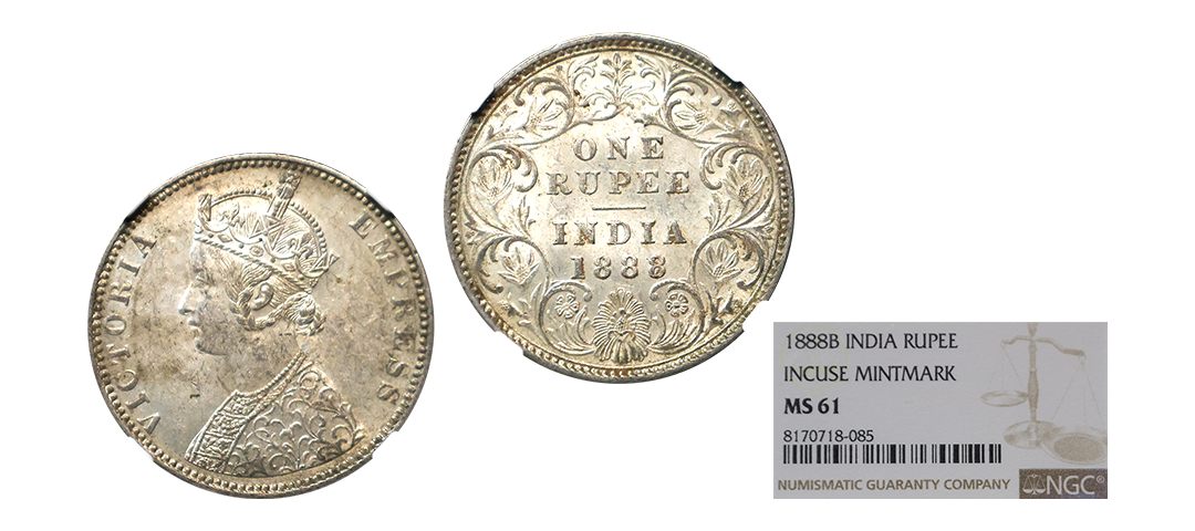 Victoria Empress, Silver Rupee, 1888, C2/I(i), B incuse on top flower, Bombay mint, Graded by NGC MS61. Rare variety and extremely rare to get in this Grade.