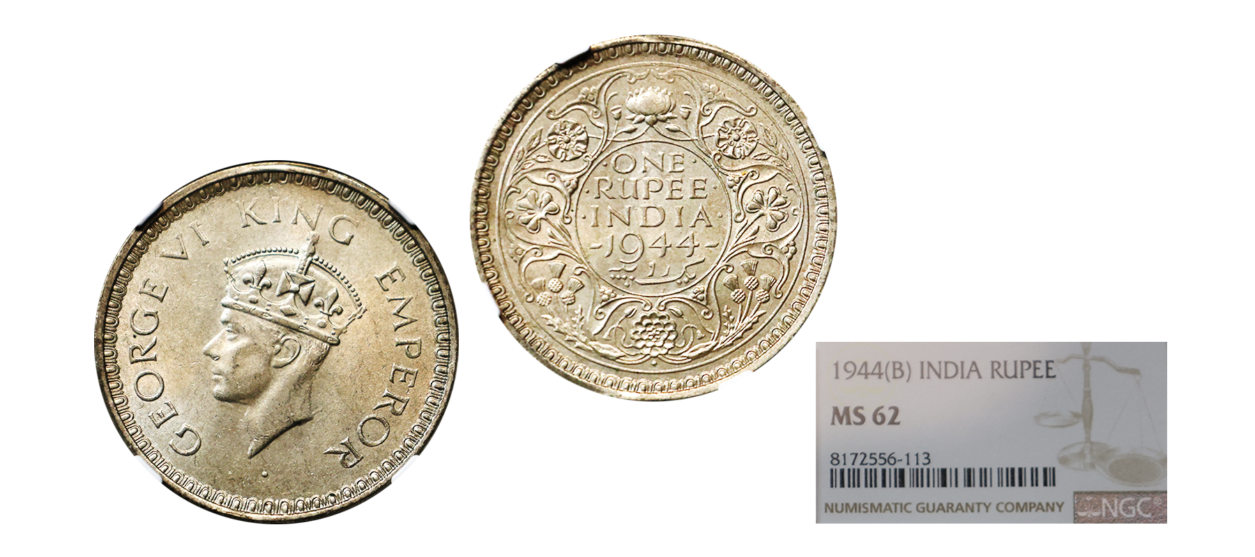 George VI, Silver Rupee, 1938, Bombay Mint, Without Mint Mark, Greded by NGC MS63.