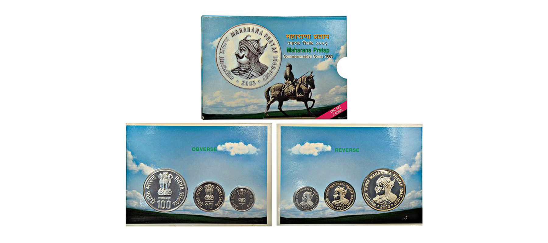 2003, Maharana Pratap, UNC set of 3 coins, 100 rupees, 10 rupees and 1 rupee, Mumbai mint, RB 263, in original mint packing.
