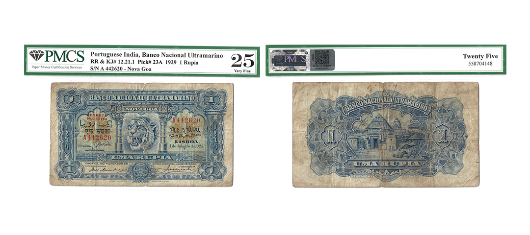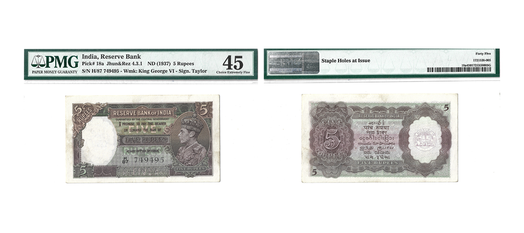 Government of India, Birtish Administration, Uniface, Rupees 5, red under print, (1918-20), signed M. M. S. Gubbay, 30 November 1918, serial number: ND72 259345, (J&R 2A.1.6.1). Corner Damge, Graded by PMG 20 Very Fine.