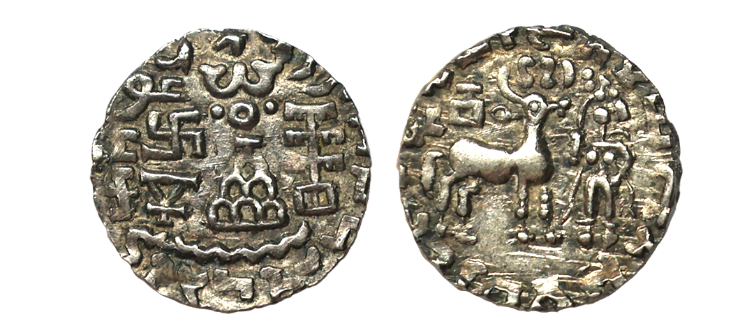 Ancient, Kuninda Dynasty, Amoghbuti (c. 200 BC), Silver Drachm, 2.07 gms, Obv. Deer to right with a fire-altar on its back, Shrivatsa in between the horns, Standing goddess Lakshmi holding a lotus stalk in front of deer, Brahmi legend around reading ‘RajnoKunimdasaAmoghabhutisa Maharajasa’, Rev. Six arched hill at center surmounted by an altar, Nandipada on top, Triangle standard and Swastika in left field, Tree-in-railing in right field, Wavy line below, Kharoshthi legend around ‘Rana KunidasaAmoghabhutisaMaharajasa‘ partially readable, Pieper # 1192, very fine+, rare.