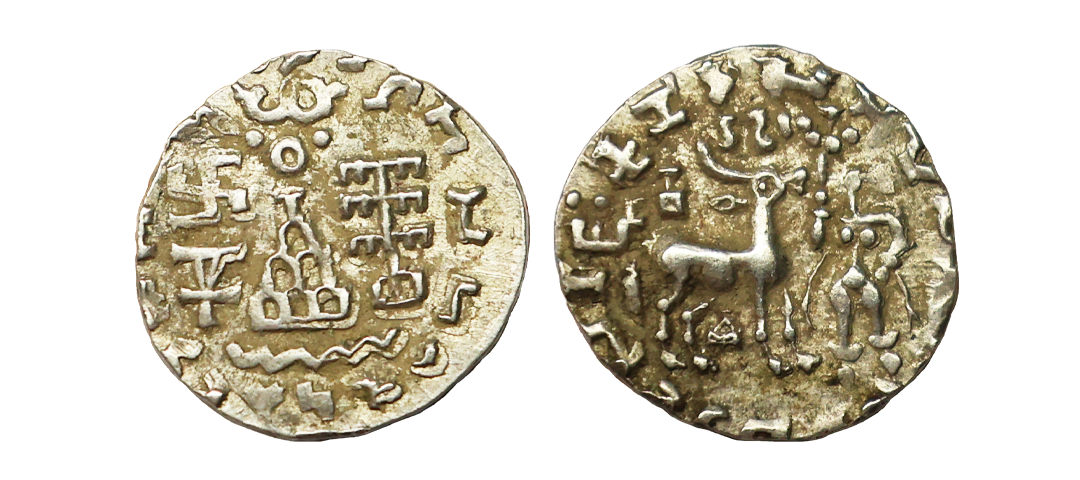 Ancient, Kunindas, Tribal Republic, Amoghabhuti (2nd-1st Century BC), Silver Drachma, 2.17 gms, Obv. Deer to right with a fire-altar on its back, Shrivatsa in between the horns, Standing goddess Lakshmi holding a Lotus stalk in front of deer, Brahmi legend around reading ‘RanoKuni(m)dasaAmoghabhutisaMaharajasa’, Rev. Six arched hill (Chaitya) at center surmounted by an altar, Nandipada on top, Triangle standard and Swastika in left field, Tree-in-railing in right field, Wavy line below, Kharoshthi legend around ‘Rana Kuni(m)dasaAmoghabhutisaMaharajasa‘ partially seen, Pieper # 1192, very fine, rare.