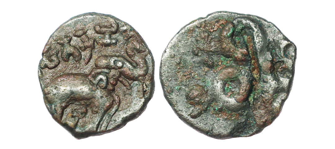 Ancient, Satavahanas, Sri Satakarani (1st century AD), Potin Unit, 3.09 gms, Obv. Elephant to right with raised trunk, Brahmi legend on its back reading ‘(RanoSiri)SaTaKaNi Sa’, Rev. Ujjain symbol, very fine, scarce.
