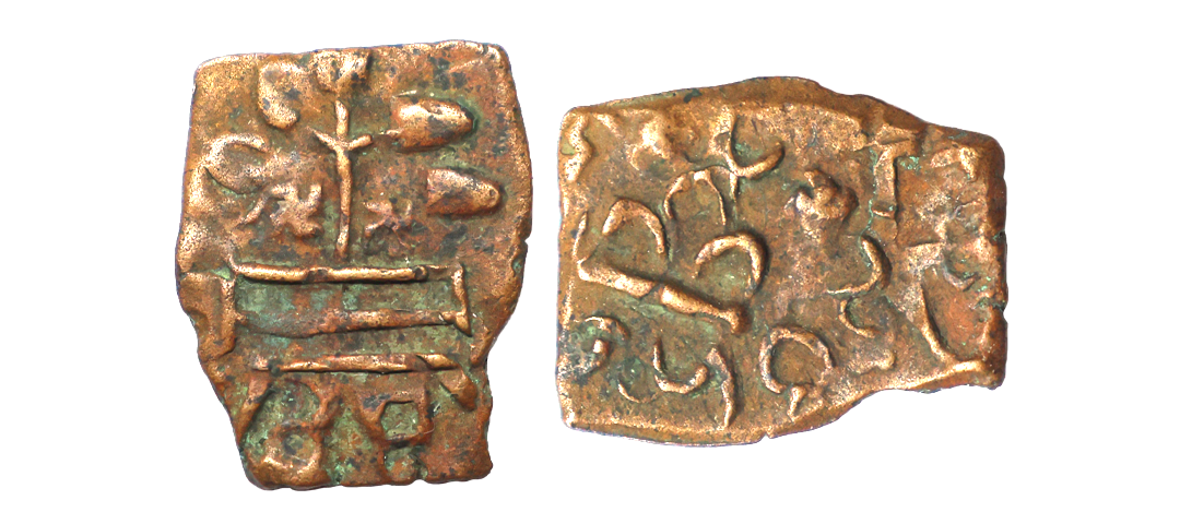 Ancient, Maharathis from Vidarbha, Maharathi Talathata (150-200 AD), Alloyed Copper Unit, 2.28 gms, Obv. Three arched hill surmounted by a crescent. Brahmi legend above reading “(MaHaRaThi)Sa TaLaTha(TaSa)”, Rev. Tree in railing with leaves radially emerging. Two ancillary nandipadas below the lower branches, Pieper #2525, very fine, rare.