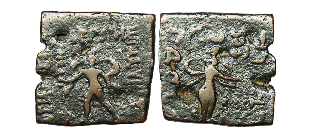 Ancient, Indo-Scythians, Maues (1st Century BC), Bronze Unit, 10.15 gms, Obv. ‘BAΣIΛEΩΣ BAΣIΛEΩN ME ΓAΛOY MAYOY’ Rev. Goddess standing to right, holding a fillet (prayer beads), Kharoshthi legend around on three sides partially reading ‘RajatirajasaMahatasaMoasa’, Senior # 20.1, fine, very scarce.