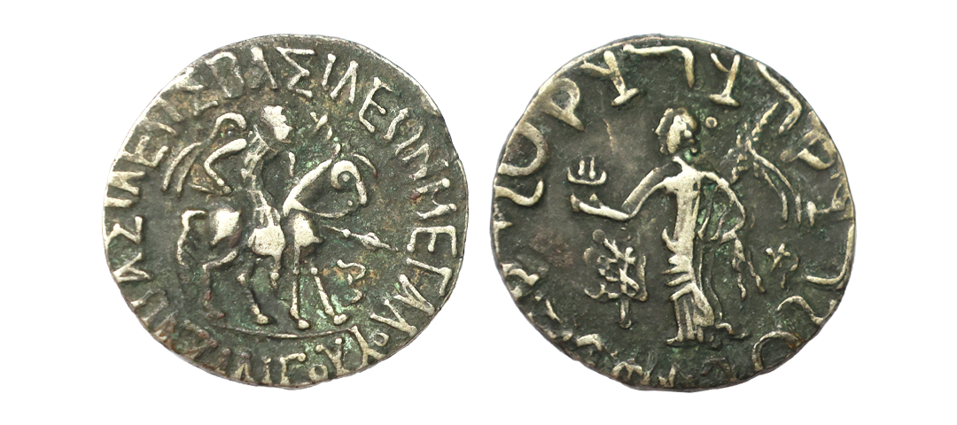 Ancient, Indo Scythian, Azilises (c. 85-45/35 BC), Silver Tetradrachm, 9.58 gms, Obv. king holding spear mounted on a horse to right, Rev. Goddess standing to left, holding Palm in left hand and a lamp in right, Kharoshthi legend around, Mitch # 2275, very fine, rare.
