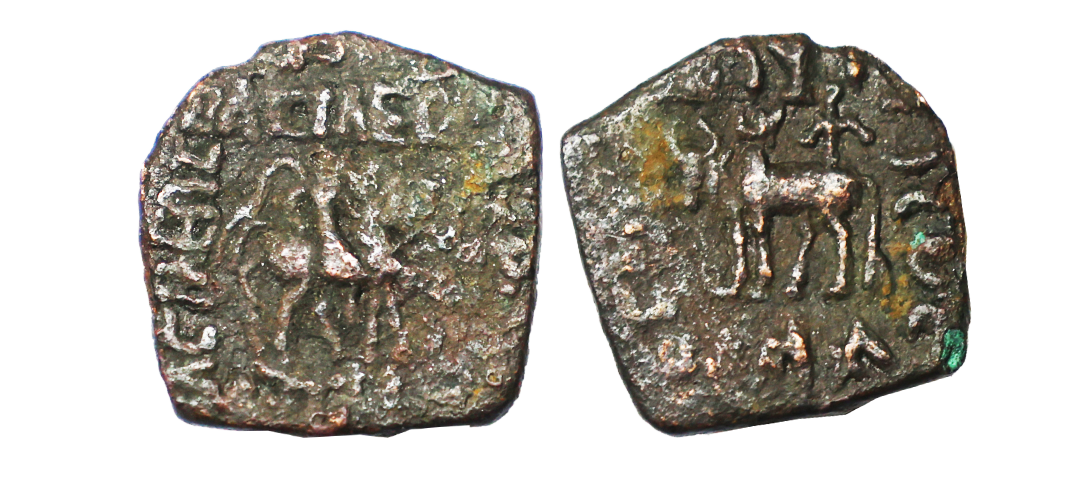 Indo Scythians, Azilises (5-45/35 BC), Copper Unit, 2.75 gms, Obv. Horserider to right holding spear Greek legends ‘BAΣIΛΕΩΣ BAΣIΛΕΩN MΕΓAΛOY AZIΛIΣOY’ around, Rev. humped to left with trident & monogram above & Kharosthi legends ‘Maharajasa rajarajasa mahatasa Ayilishasa’ around, Senior #58.3b, about very fine, very rare.