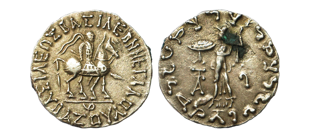 Indo-Scythians, Azes I (c. 57-35 BC), Silver Tetradrachm, 8.91g, Obv: King holding spear, mounted on horse waking to right, around Greek legend ‘BASILEOS BASILEON MEGALOY AZOY’, Rev: Athena alkidemos standing to left, holding aegis on outstretched left arm, and hurling thunderbolt with Kharoshti legend, ‘Maharajasa rajarajasa Mahatasa Ayasa’. (Bopearachchi & Rahman # 723). Very Fine+.