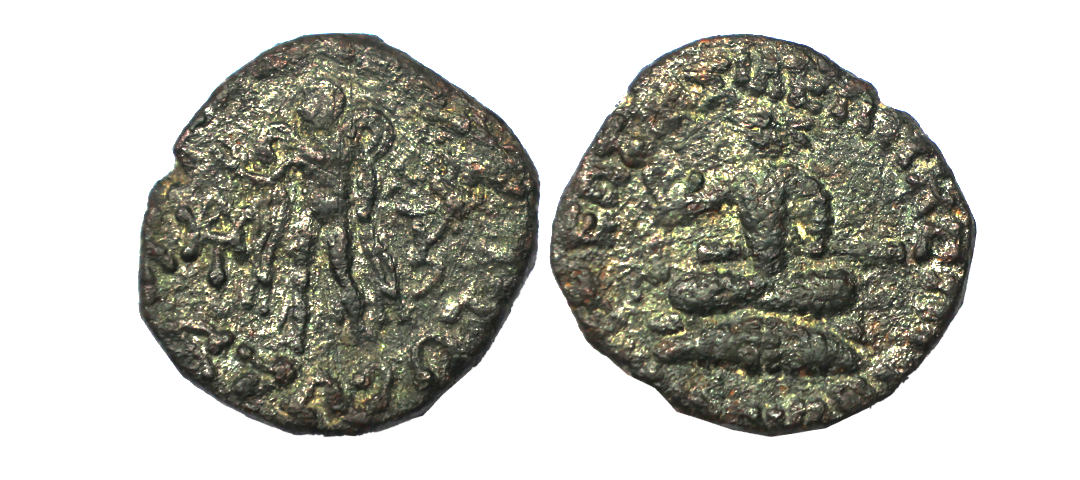 Indo Scythians, Azes (58-12 BC), Copper Unit, 9.20 gms, Obv. Azes seated on cushion, with legs crossed, raising right hand and holding sword in left, Rev. Hermes standing left, raising hand and holding kerykeion; monogram to left, similar to Senior #107.10, fine, very scarce.