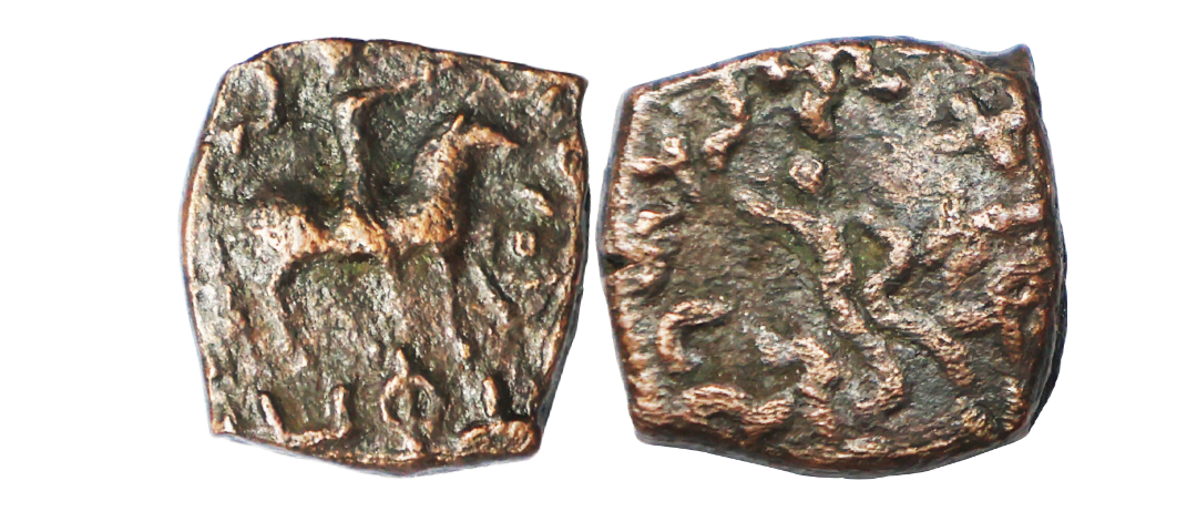 Indo Scythians, Northern Kshatraps, Mujatria (1-20 AD), Copper Unit, 2.03 gms, Obv. Mujatria on horseback to right, raising his right hand in gesture of greeting, Rev. Apollo standing, Senior #147, very fine, very rare.