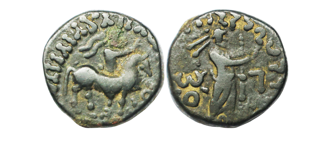 Indo Parthian, Gondopharid Dynasty, Sases (19/20-46 AD), Copper Tetradrachm, 10.21 gms, Obv. King on horseback to right with whip in hand & Greek legends around gondaphorid tamgha on right, Rev. Zeus standing right, raising hand and holding scepter, nandipada to left, ‘va’ in Kharosthi to right, Kharosthi legends ‘Maharajasa Mahatasa Tratarasa Devavratasa Guduvharasa Sasasa’ seen partially around, Senior #242.601, very fine+, rare.
