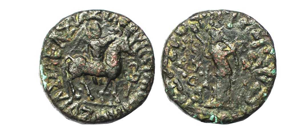 Indi Scythian, Aspavarma (15-45 AD), Apracha Rajas of Bajaur, Copper Tetradrachm, 10.02 gms, Obv. King on horseback to right holding whip Greek legends around, Rev. Pallas standing, holding long spear and small shield, nandipada to left, monogram to right, Kharosthi legends ‘Imtravarmaputrasa Aspavarmasa Stratega’ around, Senior #183.516, very fine, very rare.