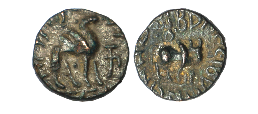 Ancient, Kushana Empire, Kujula Kadphises (c. 50-90 AD), Copper ½ Drachma, 4.12g, Obv: Humped bull standing on platform facing to right side around Greek legend, Rev: Camel facing to right front of tamgha and around Kharoshthi legend. (Jongeward, Cribb & Donovan # pl. 6). Very Fine+.