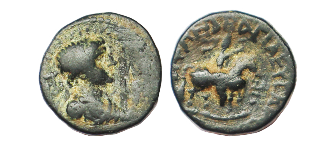 Ancient, Kushanas Dynasty, Soter Megas alias Vima Takto (c. 90th-113th AD), Copper Drachm, 2.00 gms, Obv. Bust of the Kushan ruler to right wielding a spear in front of his face and behind monogram, Rev. The King mounted on a horse to right with Kharoshti legend around and monogram front of horse, Mitch # ACW 2939, fine to very fine, scarce.
