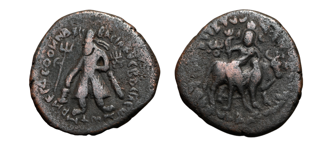 Ancient, Kushans, Vima Kadphises (110-127 AD), Copper Tetradrachm, Bilingual Type, Obv. King wearing a coat, boots and headgear, a club at right, tamgha above, king standing facing left and offering at an altar, A trident standard placed behind altar. Bactrian legend “BASILEOS BASILEON SOTER MEGAS OOEMO KADPHISES” around fully visible, Rev. Shiva (Oesho) carrying trident, reclining against Nandi bull, Nandipada in left field; Kharoshthi legend “MaharajasaRajadirajasaSarvalogaIshavarasaMahishwarasa Vema Kataphi” around partially seen, MAC # 3033-3035, very fine, very rare.