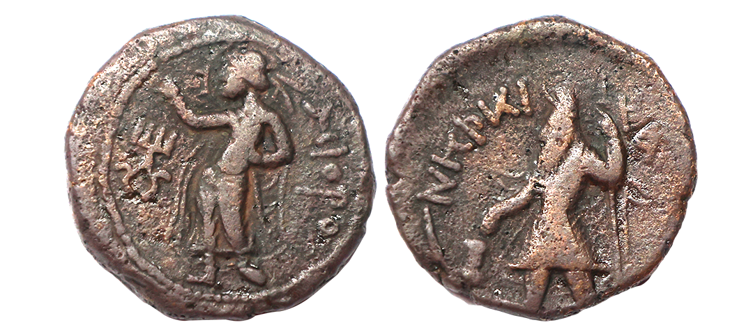Ancient, Kushans, Kanishka I (128-150 AD), Copper Tetradrachm, 14.93 gms, Obv. Crowned, diademed king standing, holding staff and sacrificing at altar at left, Bactrian legend 'ÞAO ΚA-NΗΡKI' around, Rev. Goddess ‘Miiro’ standing to left, Bactrian legend ‘Miiro’ in right field, Tamgha in left field, dotted border around, MK # 770, very fine+, rare.