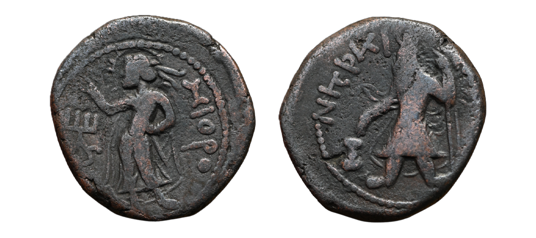 Ancient, Kushans, Kanishka I (128-150 AD), Copper Tetradrachm, Obv. Crowned, diademed king standing, holding staff and sacrificing at altar at left, Bactrian legend 'ÞAO ΚA-NΗΡKI' around, dotted border around, Rev. Goddess ‘Miiro’ standing to left, Bactrian legend ‘Miiro’ in right field, Tamgha in left field, MK # 770, very fine+, rare.