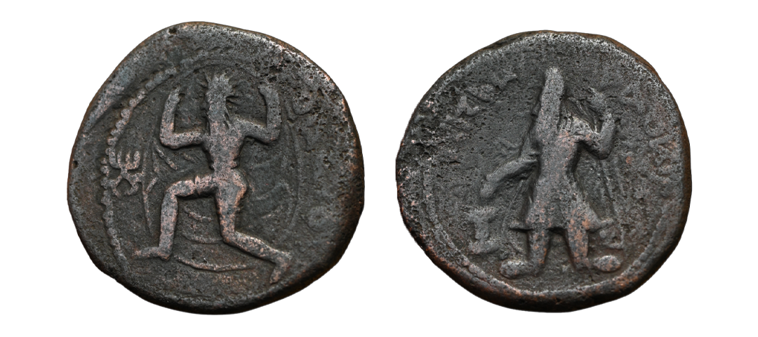 Ancient, Kushans, Kanishka I (128-150 AD), Copper Tetradrachm, Obv. Crowned, diademed king standing, holding staff and sacrificing at altar at left, Bactrian legend 'ÞAO ΚA-NΗΡKI' around, dotted border around, Rev. Wind god Oado running, holding cloak above himself, Bactrian legend 'ΟΑΔΟ' to right, dotted broders around, MK #816, very fine, rare.