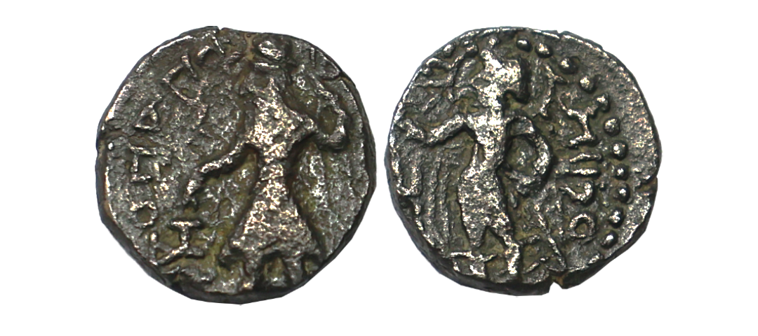 Ancient, Kushana Empire, Kanishka I (c. 127-151 AD), Copper Hemidrachms, 1.73g, Obv: : King standing facing to left holding a standard offering sacrifice at an altar, Rev: Miiro standing facing to left extending right hand in benedictional gesture, tamgha to left and label to right MIIPO. Unlisted in Cribb. Fine+.