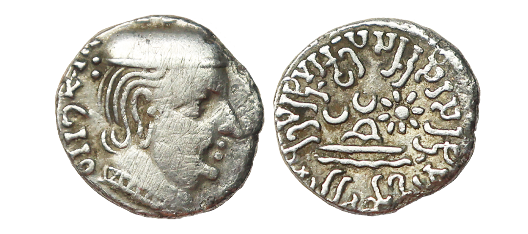 Ancient, Western Kshatrapas, Kardamaka Family, Rudrasimha I (177-198 AD), Silver Drachm, 1.76 gms, Obv. Bust of king facing to right around corrupt Greek inscription, Rev. Three arched hill below wavy line above sun and moon and around Brahmi legend, RajnoMahakshatrapasaRudradamnaputrasa’, very fine, very scarce.