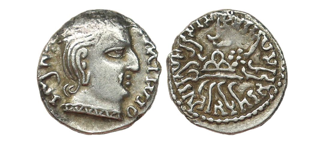 Ancient, Western Kshatrapas, Kardamaka Family, Rudrasena I (199-220 AD), Silver Drachm, 1.77 gms, Obv. Bust of king facing to right around corrupt Greek inscription, Rev. Three arched hill below wavy line above sun and moon and brhami legends around, very fine, very scarce.