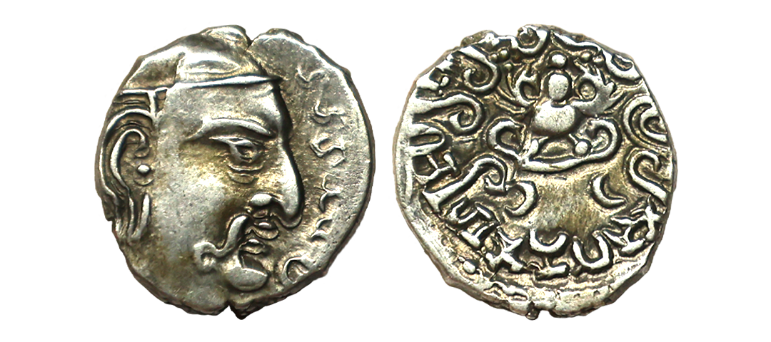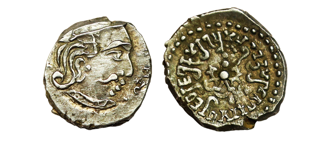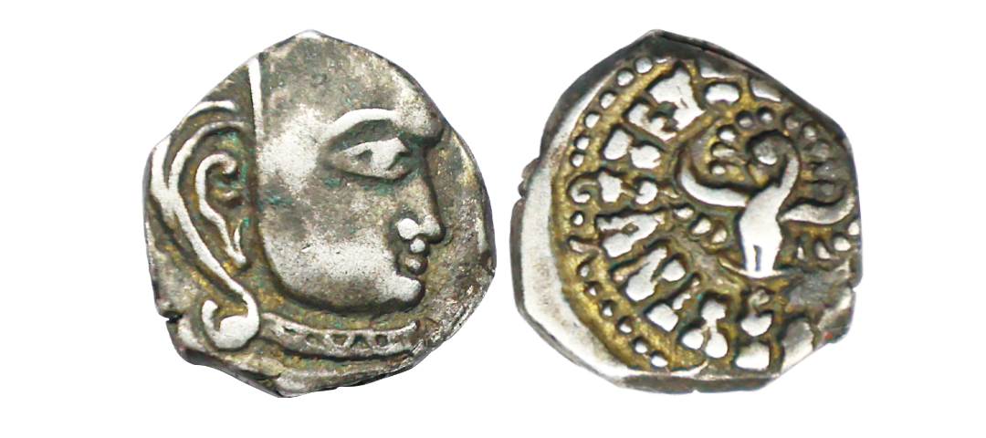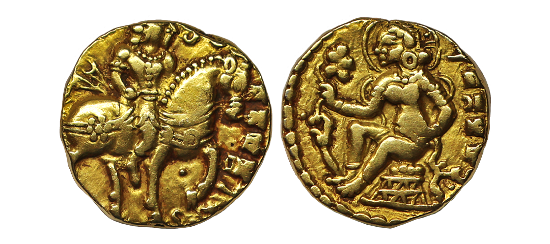 Ancient, Guptas, Kumaragupta (415-455 AD), Gold Dinara, 8.15 gms, ‘Goddess Holding a Lotus’ type, Obv. King seated on a ceremonial adorned horse to right wearing necklace & armlets and his sash flowing out from behind holding a sword in his right hand with Brahmi legend ‘Prithi)ViTaLaMa(barasasikumaragupto)’ around, Rev. Nimbate Goddess seated on a wicker stool her ears neck arm, wrist & waist are bejewelled holding a lotus with a long stalk, left hand resting on waist, Brahmi legend on the right field ‘Ajita Mahendrah’ which means Invincible Mahendra(king), All within a dotted border, TOTGE # Class II, page 388, extremely fine, extremely rare type. Note: This particular variety, ‘Goddess with Lotus’ is an extremely rare type listed as RRR in ‘Treasure of the Gupta Empire’ by S. Shivlee, similar specimen was sold in Marudhar Auction #52 for 14Lakhs on October 2025.