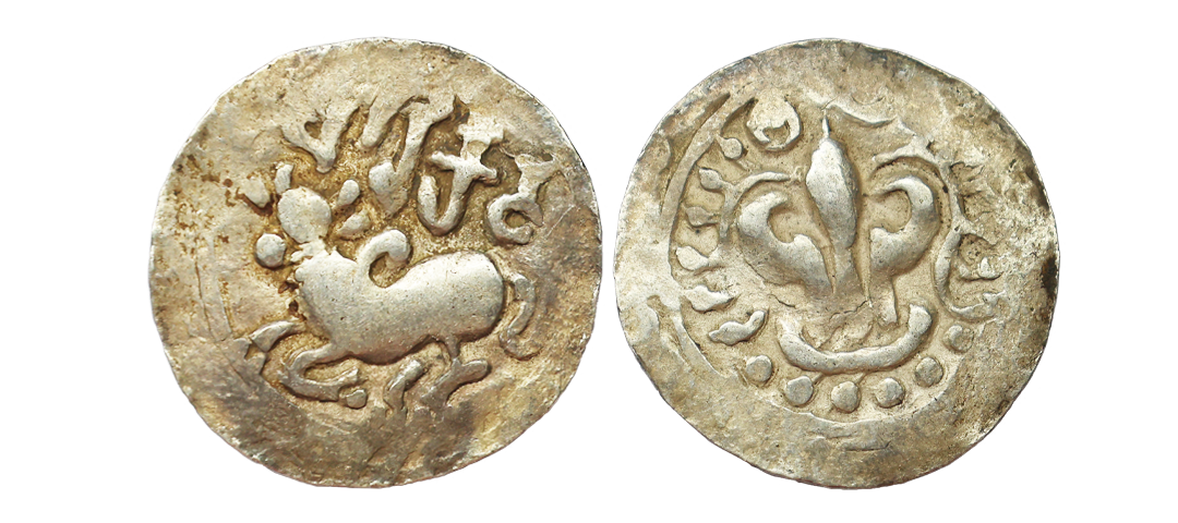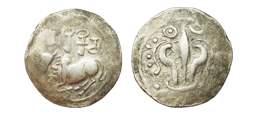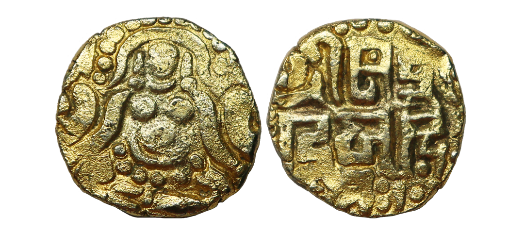 Shilaharas of Kolhapur (Feudatories of Chalukyas of Kalyana) (10-12 Century CE), Gold Fanam (U-Shaped) , 0.54 gms, Three punches consisting of a Garuda running to the right in the exergue, Kannada letter " Ude " on the right arm and legend " Kara " on the left arm, Rev. uniface, Mitch. K&A #249, extremely fine, very rare.