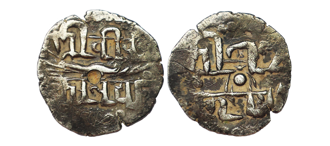 Hindu Medieval , Medieval Eastern Bengal, Harikela series(c. 10-11th Cent. AD), Silver Bracteates Unit,7.62g, Obv: Bull to left, Legend above reading ‘Harikela’, Linear and dotted circular border around, Rev: An ornate Tripatriate (Shrivatsa) symbol with Sun and Moon on top, Linear and dotted circular border around. (Bose and Nasir # Type D). Very Fine+