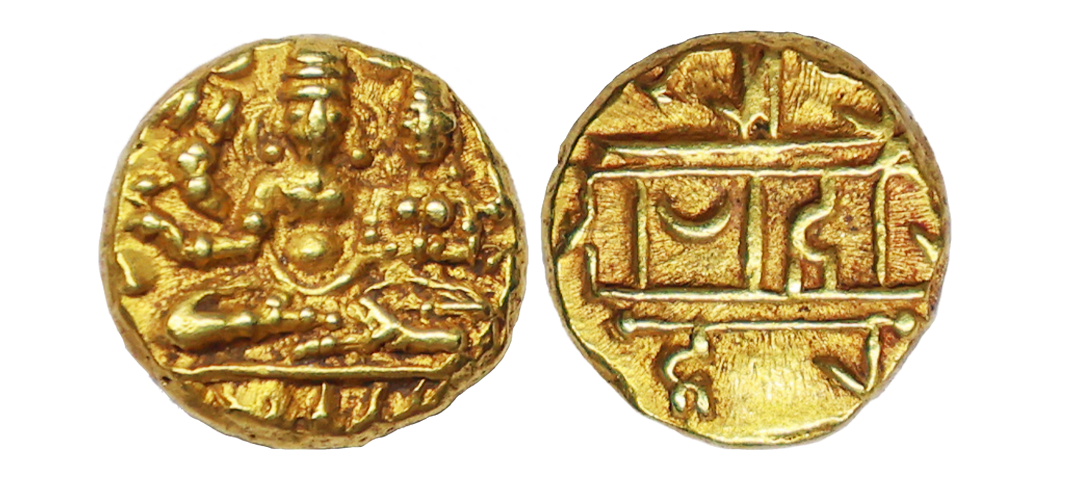 Hindu Medieval, Vijayanagara Empire, Sangama Dynasty, Harihara II (13th-14th Century AD), Gold ½ Varaha, 1.70 gms, Obv. Narasimha seated in padmasana with his consort Lakshmi on his left thigh; the god holds a discus in one right hand and the other is in abhayamudra, one left hand holds a conch-shell (shankha) while the other is around his consort’s waist, Rev. Devanagari legend in three lines "Sri pra/tha pa Hari/hara", Mitch. K&A # 413, Dr. M. Girijapathi # 056, rare in this condition.