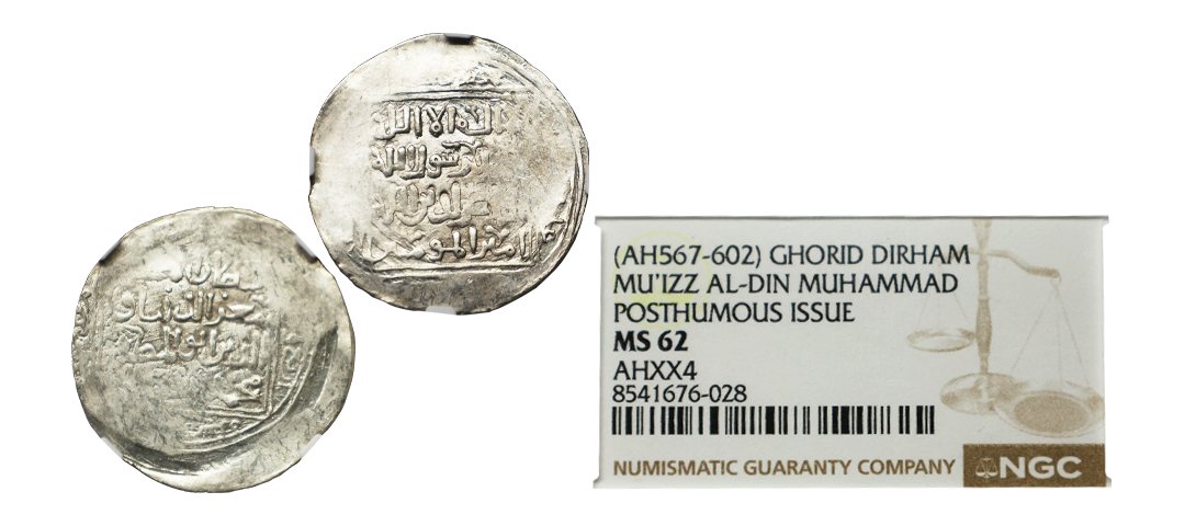 Delhi Sultan, Ghorids, Muiz al-Din Muhammad Bin Sam (Shihab al-Din Muhammad Ghori) (567-602 AH/1171-1206 CE), Silver Dirham, Baldat Ghazna Mint, AH 604, citing the Abbasid Caliph Al-Nasir Li Deen Allah (reign: 1180-1225 CE), Album #1772, Graded by NGC as MS62, Top-Pop, very rare.