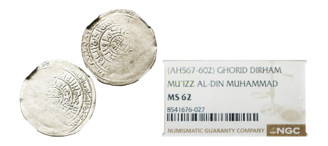 Delhi Sultanate, Turk Dynasty, Mu'izz ud-din Muhammad bin Sam (AH 589-602/1193-1206 AD), Silver Dirham, Citing his brother Ghiyath ud din as Supreme Chief of the Ghurids, Obv: Kufic Arabic legend featuring the Kalima and names of the four rightly Guided Caliphs, with inscription: "al-sultan al-a zam Ghiyath ud-dunya wa'l-din Mahmud bin Muhammad bin Sam", arranged in concentric circles, Rev: Kufic Arabic legend: "al-sultan al-a'zam Mu'izz ud-dunya wa'l-din Abu'l Muzaffar Muhammad bin Sam", also within concentric circles, 3.73g, 26.70mm, (G&G #D3), some usual area flatness, but almost legible legends on both sides, graded by NGC as MS 62, Extremely Rare in this grade.