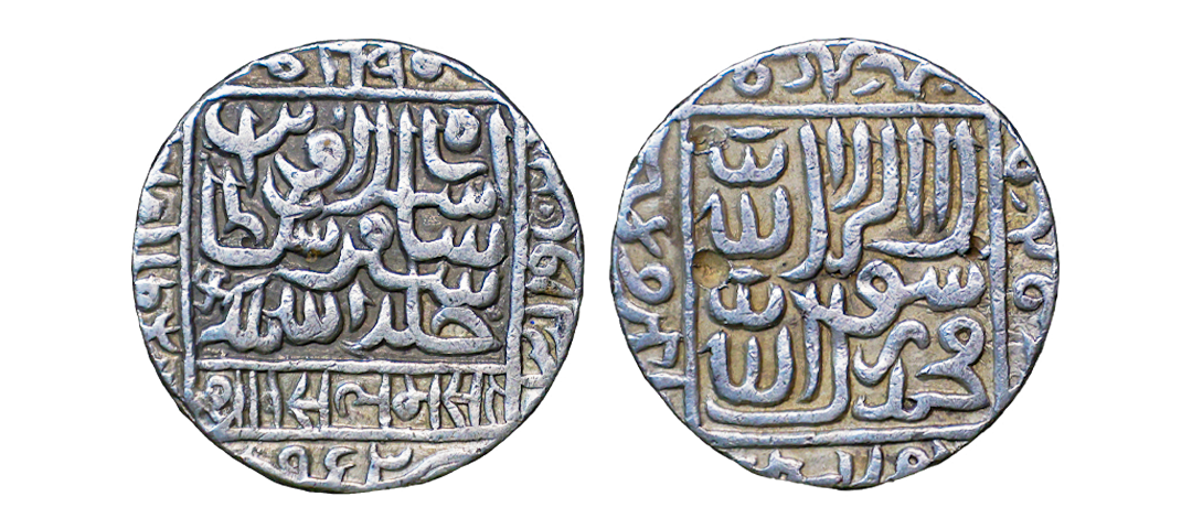 Delhi Sultan, Islam Shah Suri (AH 952-960, 1545-1552 AD), Silver Rupee, 11.36 gms, Qila Raisen Mint, AH 953, swastik as a mint mark, Obv. islam shah ibn sher shah sultan, khuld allahu mulkahu, Rev. Kalima shahada around four khalifas name, G&G # D966, very fine, very rare.