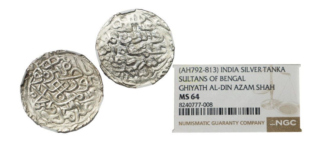 Bengal Sultan, Ghiyath al-din Bahadur joint issue with Muhammad bin Tughlaq, Sultan of Delhi, Silver Tanka, 10.86 gms, Hadrat Sunargaon Mint, Obv. Darb bi -Amr al-Wathiqq Billah Muhammad bin Tughlaq shah, Rev. al -Sultan al-Mu'azzam Ghiyath al-Dunya wa al-Din Abu al-Muzaffar Bahadur Shah al-Sultan bin al –Sultan, G&G # B116, very fine, extremely rare.