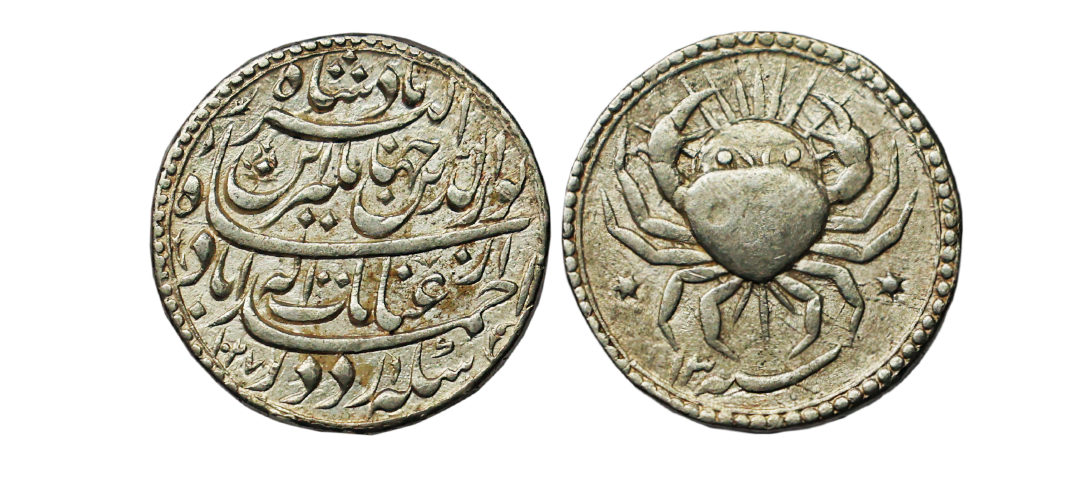 Mughal, Jahangir (AH 1014-1037, 1605-1627 AD), Silver Zodiac Rupee, 11.41 gms, Ahmadabad Mint, AH 1027, RY 13, Zodiac Sign ‘Cancer’ corresponding to Ilahi month of Tir, ‘Inayat-e-ilah’ Couplet, Obv. Cancer the crab, radiate sun behind RY below Sanah 13, Rev. Sikka zad dar Ahmadabad az Inayat-e-ilah Shah Nur Al din Jahangir ibn-e Akbar Badshah, date below 1027, Unlisted in KM, Rarest of the rare Zodiac signs with ‘Inayat-e-ilah’ Couplet, only Handful specimens known, extremely fine+, exceedingly rare. Meaning of Couplet: Struck money at Ahmadabad by the blessing of God, Shah Nooruddin Jahangir son of Akbar Badshah. Note: Jahangir 'Inayat-e-ilah' couplet coins featuring the ‘Cancer’ zodiac sign are among the rarest of all Jahangir zodiac rupees. They are notably absent from many major Mughal numismatic collections, which further enhances their desirability. The specific couplet, significantly rarer than those bearing the more common 'Zad Zewar' couplet. The offered coin is in immaculate condition and represents a highly sought-after specimen for discerning collectors of top-tier Mughal coinage.