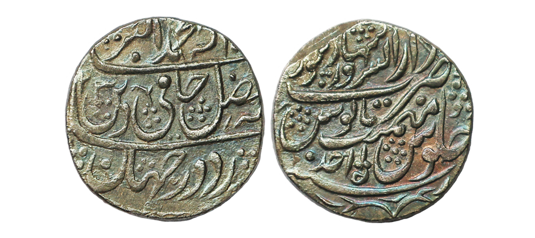 Mughal, Muhammad Akbar II (1st Reign AH 1203/1788 AD), Silver Rupee, 10.97 gms, Dar us Sarur Saharanpur Mint, AH 1203/Ahad RY, "Hami-e-din" Couplet, Obv. sikka zad dar jahan ba fazle elah, hami e dine Muhammad Akbar Shah, Rev. sana julus maimanat manus zarb Dar us Sarur Saharanpur sword mark below, KM #760, very fine+, extremely rare.