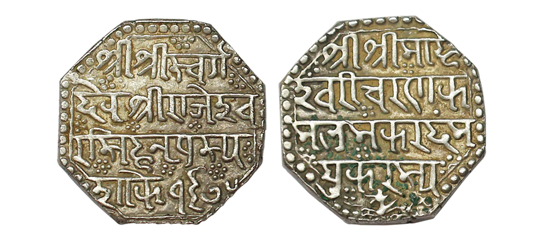 Assam, Pramatta Simha or Siu-ning-pha (SE 1666-1673, 1744-1751 AD), Silver Rupee, 11.40 gms, Ahom Legends type, Year 36, Obv. Kao boi/ Pha Leng-do/n heu, winged lion to left, Rev. Chao Siu-/ning-pha pin-/khun lak-ni/ Kat-keo, R&B N1.1, KM#123, centrally struck with a very high relief & brilliant surface, complete dotted borders on flan, uncirculated, extremely rare.