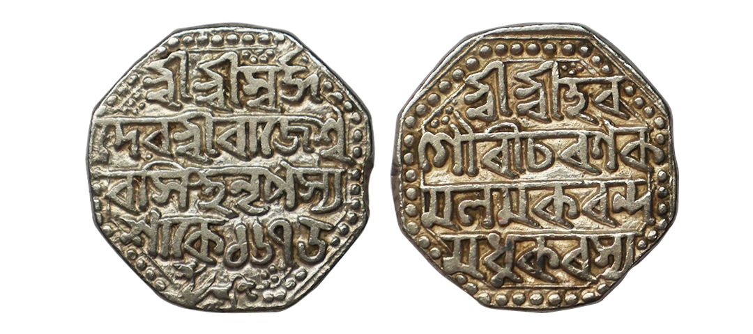 Assam, Pramatta Simha or Siu-ning-pha (SE 1666-1673, 1744-1751 AD), Silver Rupee, 11.40 gms, Ahom Legends type, Year 36, Obv. Kao boi/ Pha Leng-do/n heu, winged lion to left, Rev. Chao Siu-/ning-pha pin-/khun lak-ni/ Kat-keo, R&B N1.1, KM#123, centrally struck with a very high relief & brilliant surface, complete dotted borders on flan, uncirculated, extremely rare.