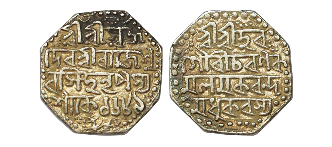 Assam, Pramatta Simha or Siu-ning-pha (SE 1666-1673, 1744-1751 AD), Silver Rupee, 11.40 gms, Ahom Legends type, Year 36, Obv. Kao boi/ Pha Leng-do/n heu, winged lion to left, Rev. Chao Siu-/ning-pha pin-/khun lak-ni/ Kat-keo, R&B N1.1, KM#123, centrally struck with a very high relief & brilliant surface, complete dotted borders on flan, uncirculated, extremely rare.