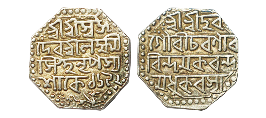 Note: Rajeshwara Simha used Devanagari legends on some of his coinage due to the increasing influence of Brahmanical culture and Hinduism within the Ahom kingdom, which led to the adoption of the Sanskrit language and the associated Assamese-Bengali & Devanagari script for official purposes, including coinage. The legends on the coins typically invoked Hindu deities, such as Lord Shiva and his consort Goddess Gauri (Parvati). Using Sanskrit in the local script served to emphasize the king's devotion and reinforce the Hindu identity of the kingdom. He also issued coins with Persian script, reflecting Mughal influence in other areas.