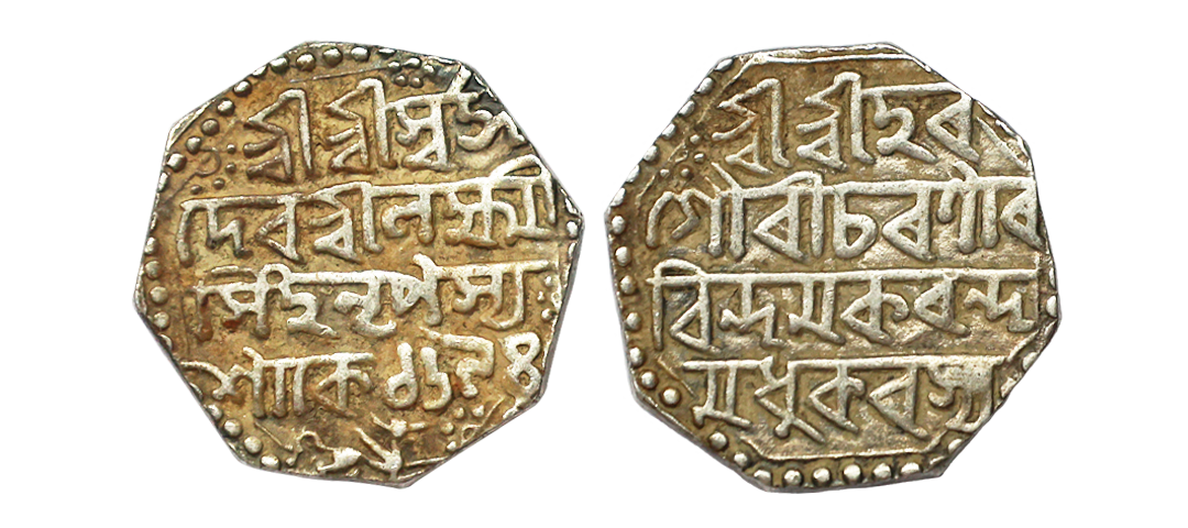 Assam, Rajesvara Simha (1751-1769 AD), silver rupee, sake 1675, 11.20g. Obv: Legend Sri Sri Hara/Gauri Charana Ka/mala Makaranda/Madhukarasya, six dots at top right. Rev: Legend Sri Sri Svarga/Deva Sri Rajesva/ra Simha NrPasya/sake 1675, winged lion facing to left, both sides legend in four lines, R&B.O37.4. Very fine, Very scarce.