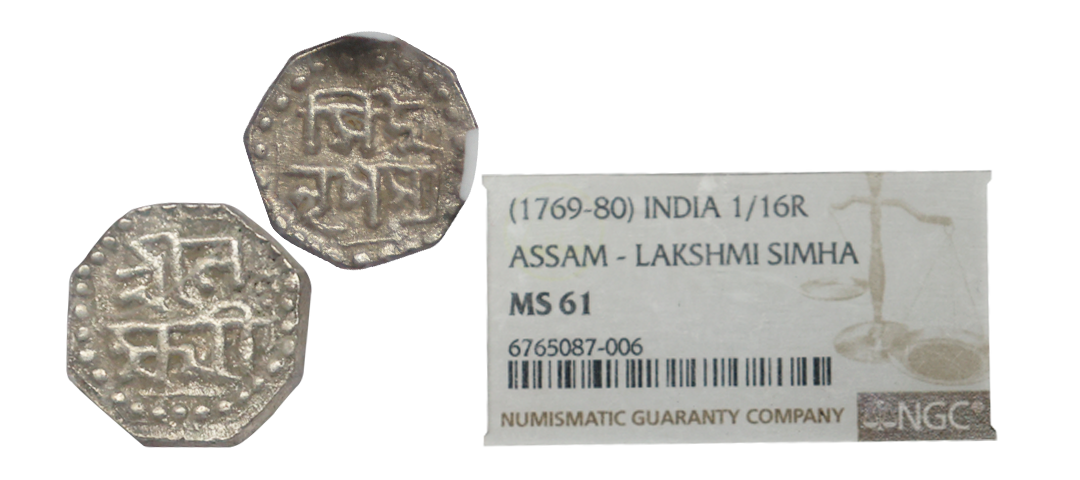 Assam, Lakshmi Simha (SE 1691-1702, 1769-1780 AD), Octagonal Silver 1/16 Rupee, Obv. Sri La/ksmi, Rev. Simha/ Nrpasya R&B #Q60.1, KM # 174, graded by NGC as MS61, rare.